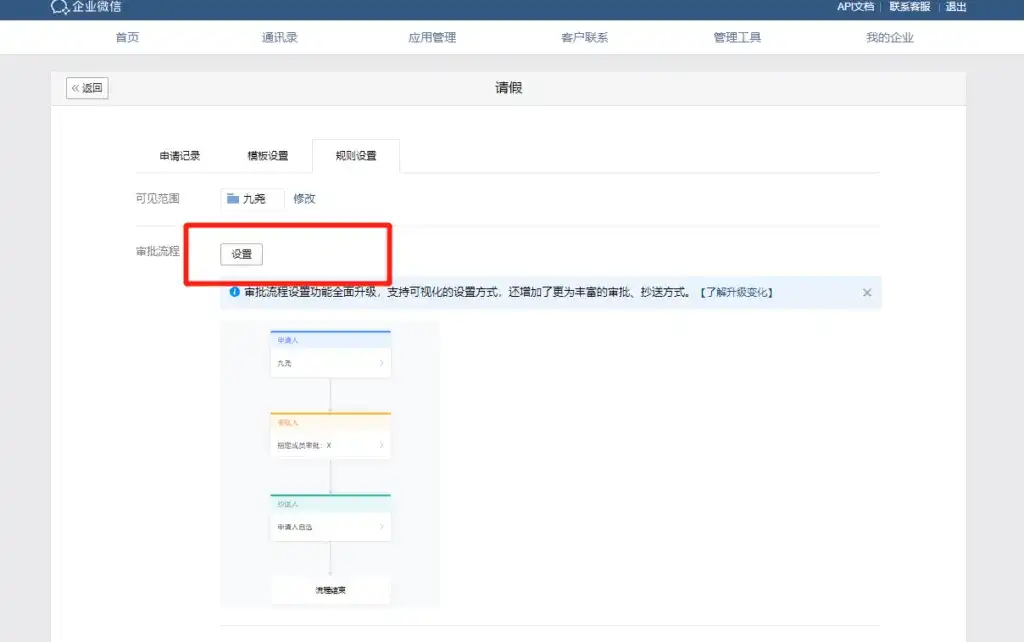 - 审批流程设置(最常用) 后台 > 应用管理 > 审批 > 新建模板。 内置请假、报销、出差、加班等模板,直接启用或自定义。 实操技巧: