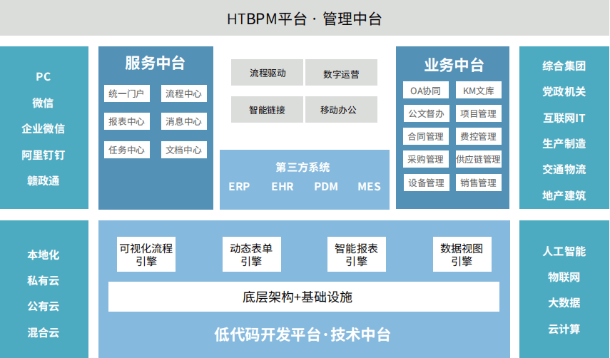 企业级BPM低代码平台 灵活应对个性化需求,让二次开发成本降低80% 告别传统开发的高昂投入与长周期。依托BPM引擎强大的低代码扩展能力,通过可视化配置与少量代码即可实现复杂业务逻辑,快速填补标准软件的功能缺口。 联系我们 整体概览 基于四大核心引擎的“管理+技术”双核架构。向下兼容多环境,向上连接企微钉钉,中间融合ERP财务系统,为您构建一体化的数字化运营中心。 流程引擎 流程建模 BPMN标准:拖拽定义串行及分支流转,轻松构建复杂逻辑; 可视设计:所见即所得,像画思维导图一样简单直观。 全局控制 属性管理:支持流程版本控制,灵活应对业务迭代需求; 执行监听:内置全链路事件监听,自动触发回调监控。 审批规则 智能分派:支持角色及脚本找人,灵活配置会签与或签; 权限管控:一键开启移动端提交与回退,满足多端办公。 深度集成 API集成:开放验证与执行API,实现业务系统双向联动; 脚本扩展:内置脚本编辑器,编写代码处理复杂规则。 表单引擎 交互设计 拖拽布局: 采用响应式栅格系统,支持自由拖拽、多列混排,所见即所得; 智能校验: 内置正则匹配、非空校验及唯一性检查,前端即时拦截异常数据。 属性配置 逻辑控制: 支持字段显隐、读写权限及输入统计,简单勾选即可定义复杂逻辑; 动态赋值: 可绑定系统变量(如当前用户、时间)为默认值,减少人工录入成本。 丰富组件 通用控件: 提供文本、级联、日期等30+种基础组件,满足95%填报需求; 业务组件: 内置部门人员、子表单等高级控件,自动关联组织数据,开箱即用。 场景适配 多端响应: 遵循响应式标准,一次拖拽布局,自动适配PC端与移动端; 灵活拓展: 支持用户自定义添加私有组件,根据业务特性无限拓展能力边界。 交互体验 文件管理: 集成图片与文件上传控件,支持多文件拖拽上传与在线预览,附件归档更便捷; 便捷录入: 提供开关、滑块、评分及颜色选择器,丰富的交互形式大幅提升用户填报体验。 报表引擎 数据准备-支持多数据源 支持视图、SQL、存储过程和自定义等四种数据源,无论你的数据存储多么分散都可以快速抓取,轻松整合助力企业形成全局数据视野,实现企业数据治理的智慧运营。 报表设计-按需快速适配 提供可视化托拉拽和脚本样例套用两大模式,前者通过类Excel操作在画布栏拖拽字段绑定单元格,后者一键导入看中的模板示例脚本修改对应参数,均能快速完成报表配置! 视图引擎 快速配置 天翎视图引擎提供表单一键自动生成、模板复制和批量配置等三种视图开发模式,视图配置几乎无需代码,同一份数据还可按用户需求差异和操作差异配置出千人千面的差异化效果。 丰富样式 除普通列表视图外,天翎视图引擎还提供树型视图、日历视图、GIS视图、甘特视图和折叠视图等丰富的样式,用户可以根据业务特性和操作习惯灵活选择及切换。